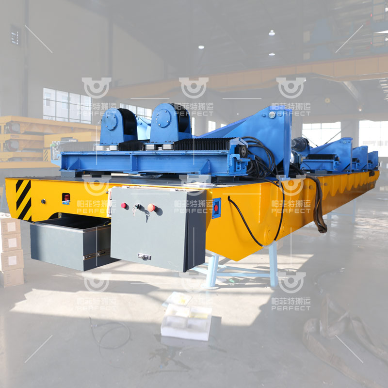 該車主要用于搬運輪船配件,由于工件重量比較重,而且需要進入噴砂房,噴砂房行車進不去,顧采用平車,由于噴砂環境粉塵大,平車需要做防護,