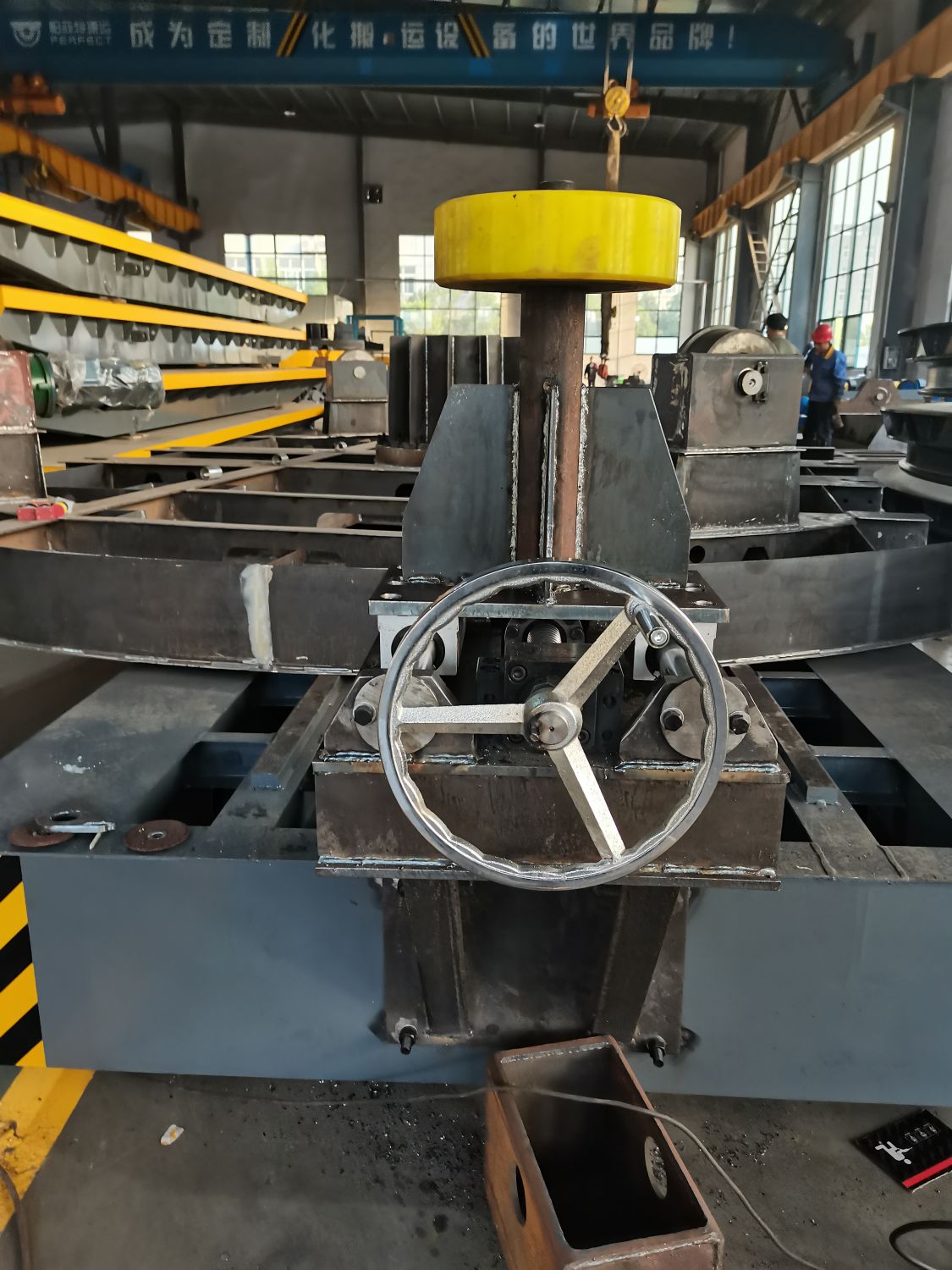 河南帕菲特為客戶項目工程中提供的一套設備,要處理的事不同直徑長度的筒體,車體臺面設有電動滾輪架,防竄動端部定位輪,鏤空臺面方便砂粒堆積,是一套專用定制設備。。